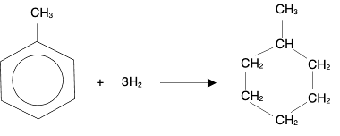 However, for these hydrocarbons, combustion is hardly ever complete, especially if they are burnt in air. The high proportion of carbon in the molecules means that you need a very high proportion of oxygen to hydrocarbon to get complete combustion. Look at the equations. As a general rule, the hydrogen in a hydrocarbon tends to get what oxygen is available first, leaving the carbon to form carbon itself, or carbon monoxide, if there isn't enough oxygen to go round. The arenes tend to burn in air with extremely smoky flames - full of carbon particles. You almost invariably get incomplete combustion, and the arenes can be recognised by the smokiness of their flames. Hydrogenation Hydrogenation is an addition reaction in which hydrogen atoms are added all the way around the benzene ring. A cycloalkane is formed. For example: With benzene: